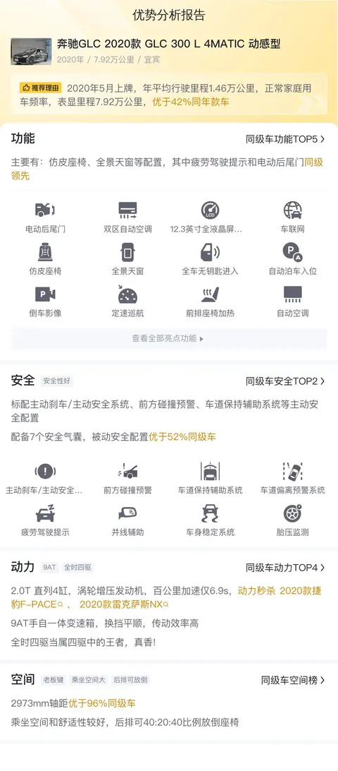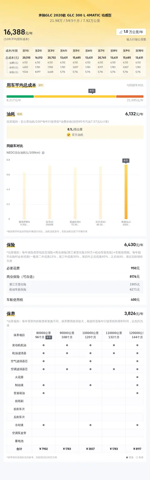 根据当前二手车市场的行情来看,这款奔驰GLC 2020款 GLC 300 L 4MATIC 动感型的售价相对较为合理。考虑到其车况良好、配置丰富以及奔驰品牌的影响力等因素,在合理的价格范围内购买这样一辆二手车无疑是物有所值的。当然,在做出购买决策之前,建议消费者还是要亲自查看车辆实际情况,确保车况如描述一般良好。从长期使用的角度来看,这款二手奔驰GLC 300 L的平均用车成本大约为每年1.6万元左右。这项支出主要包括油费、保养费以及保险费等。虽然作为一款豪华SUV,其维护和保养成本相对较高,但与同级别的新车相比,二手车的总体用车成本还是要低不少的。毕竟折旧最狠的那几年已经过去了。