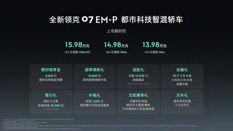 对于刚步入社会、预算有限却不愿妥协性能的年轻人而言,全新领克 07EM-P 以13.98万起的限时价,提供了 “低价不低质” 的选择,搭配丰厚的上市限时权益,更是降低了购车门槛,成为年轻人开启独立生活、探索多元出行的理想座驾。