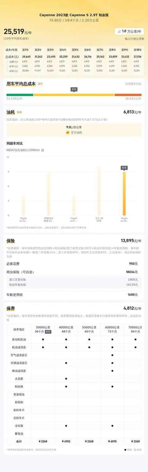 据估算,同级车的最低用车成本是17478元/年,最高是43721元/年,Cayenne 2023款 Cayenne S 2.9T 铂金版是25680元/年,所以用车成本也适中。
