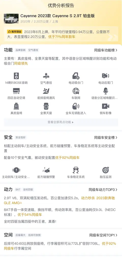Cayenne 2023款 Cayenne S 2.9T 铂金版,新车含税价为132.83万,而现在的二手车报价是79.8万,2023年6月首次上牌,在此期间过户1次。