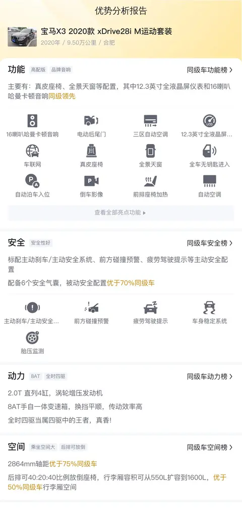 在二手车市场中,寻找一辆车况良好、性价比高的车型并非易事。而这辆宝马X3 2020款 xDrive28i M运动套装,无疑是一个难得的佳选。它不仅继承了宝马X家族的纯正血统,更在细节之处彰显了宝马对驾驶乐趣与日常实用性的不懈追求。高效的动力系统、豪华的内饰配置、先进的安全技术,以及出色的车况与合理的用车成本,都使其成为了一款集品质、性能与价值于一体的理想之选。如果您正在寻找一辆既能满足日常出行需求,又能带来高端驾乘体验的二手车,那么这辆宝马X3无疑是一个值得认真考虑的选择。