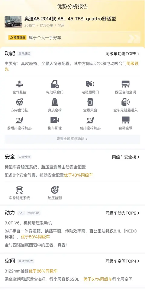 这辆奥迪A8 2014款 A8L 45 TFSI quattro舒适型各方面表现都非常出色,尤其是动力和配置方面,作为一款豪华车型,它在动力性能方面有着不俗的表现。搭载的3.0T V6机械增压发动机提供了强劲的动力输出,确保了迅捷的加速响应和充沛的动力储备。其8AT手自一体变速箱不仅换挡平顺,还具备高效的传动效率,能够优化燃油消耗。全时四驱系统则为车辆带来了出色的操控稳定性和通过性,使其在各种路况下都能保持卓越的行驶性能。在配置方面,该车同样表现出色。全景天窗营造了开阔的视野和舒适的乘坐环境;而方向盘记忆和电动吸合门等配置,则体现了奥迪在细节上的精心设计,为驾驶者和乘客带来了更加便捷和豪华的用车体验。无论是从哪个方面来看,这都是一款非常不错的车型,不过考虑到该车已经行驶了17万公里,还是要综合评判,做出选择。