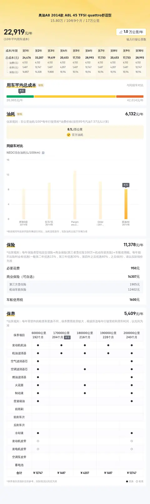 奥迪A8 2014款 A8L 45 TFSI quattro舒适型的10年平均用车成本是23238元/年,而同级车的最低10年平均用车成本是19068元/年,最高是43766元/年,所以用车成本较低。