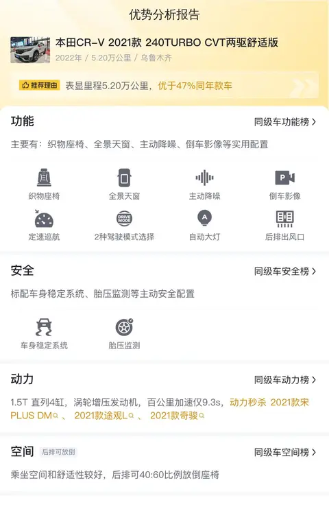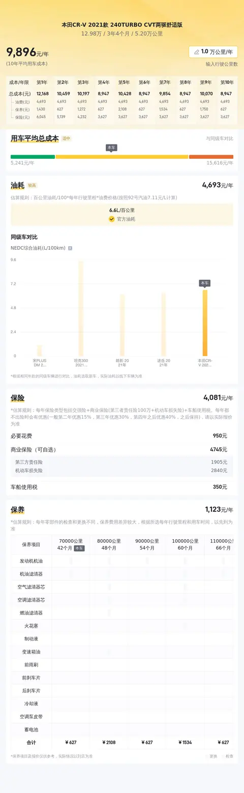 根据大数据分析显示,目前这款本田CR-V在全国二手车市场上具有较高的性价比优势,并且保值率也相对较高。此外,根据估算数据显示,这款本田CR-V的年均综合用车成本大约为1.1万元左右。考虑到其优秀的燃油经济性和良好的车况维护,这一成本在同级别车型中也属于合理范围之内。