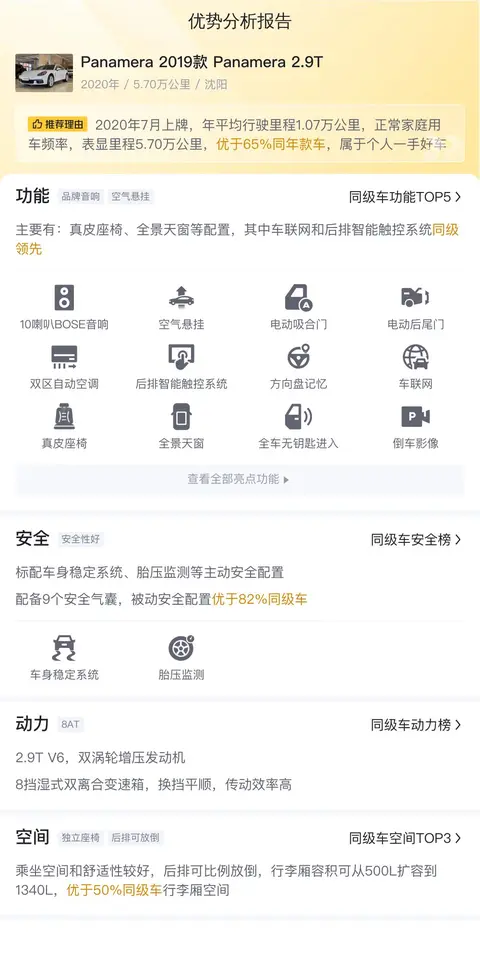 报价相对较低,Panamera 2019款 Panamera 2.9T的市场行情价是56.17万-67.56万,它的报价是62.80万,所以价格上不占优势,不过它56.67%的保值率偏高,因为同级车的仅仅是41.06%。