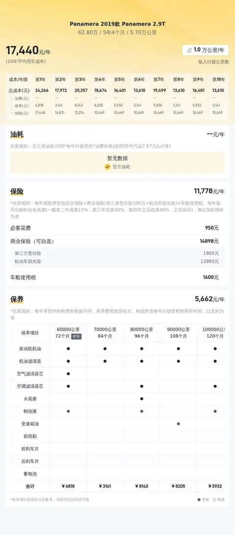 据估算,Panamera 2019款 Panamera 2.9T的用车成本是33018元/年,原价百万级别的车,这样的花费算是正常情况。