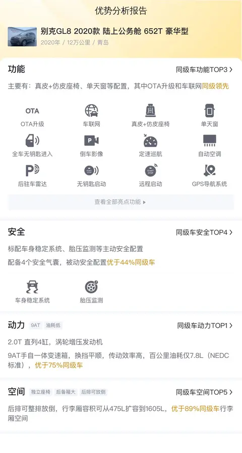 该车在配置方面,主要有真皮+仿皮座椅、单天窗等配置,其中OTA升级和车联网同级领先。从安全配置方面来看,该车标配车身稳定系统、胎压监测等主动安全配置,同时配备6个安全气囊,使其被动安全配置优于62%同级车。从动力方面来看,2.0T 直列4缸,涡轮增压发动机,9AT手自一体变速箱,换挡平顺,传动效率高,百公里油耗仅7.8L(NEDC标准),优于75%同级车。从空间方面来看,后排可整排放倒,行李厢容积可从475L扩容到1605L,优于89%同级车行李厢空间。