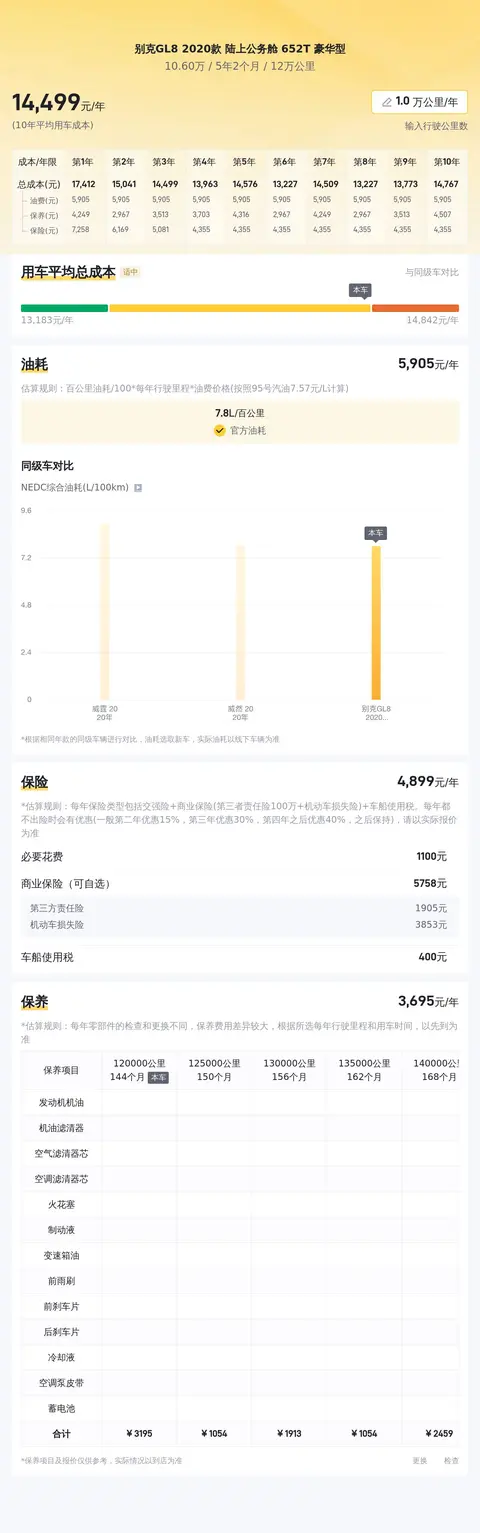 从数据上我们可以看到,别克GL8 2020款 陆上公务舱 652T 豪华型的10年平均用车成本约14187元/年,而同级车最低10年平均用车成本约13363元/年,最高10年平均用车成本约16371元/年,所以该车的用车成本适中,同时该车的10年平均油耗为7.8L/百公里,而同级车最低油耗为7.8L/百公里,最高油耗10.4L/百公里,相对来说,该车油耗较低。
