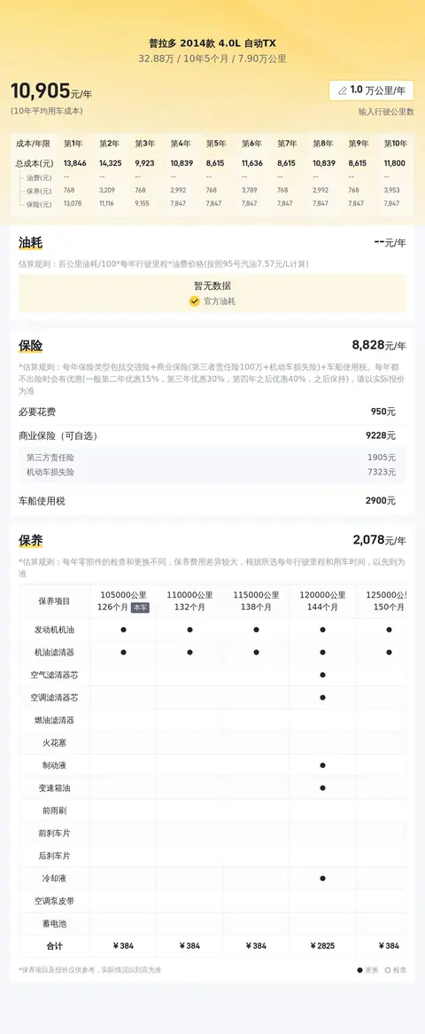 在二手车市场上,普拉多 2014款 4.0L 自动TX的售价在30.64万至38.65万之间。而这款车的售价仅为32.88万,相较于新车含税价,节省了25.21万。在用车成本方面,该车10年平均用车成本为21807元/年,相较于同级车较高。但考虑到该车的车况良好、配置实用、保值率较高等因素,其综合性价比仍然较高。