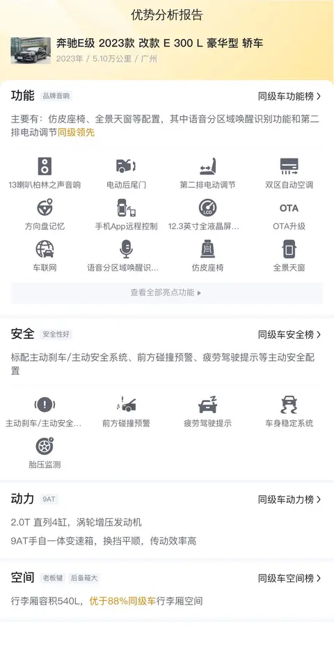 今天介绍的这台车是奔驰E级 2023款 改款 E 300 L 豪华型 轿车,车源地在广州,上牌时间是2023年5月,有过一次过户记录,行驶里程5.1万公里,黑色车漆,新车含税价55.01万,现在二手报价33.88万。