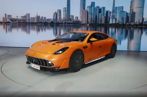 展开来看,AMG GT XX采用橙色涂装,整车配备了3台轴向磁通电机,总输出功率高达1340匹马力,最高时速可达350km/h,就性能来说,不输于特斯拉Model S Plaid,预计新车的零百加速又是一个“2秒俱乐部”水平。电池方面,新车搭载美国公司生产的圆柱形锂离子电池组,拥有850kW快充能力,理论上5分钟可以增加400km纯电续航。