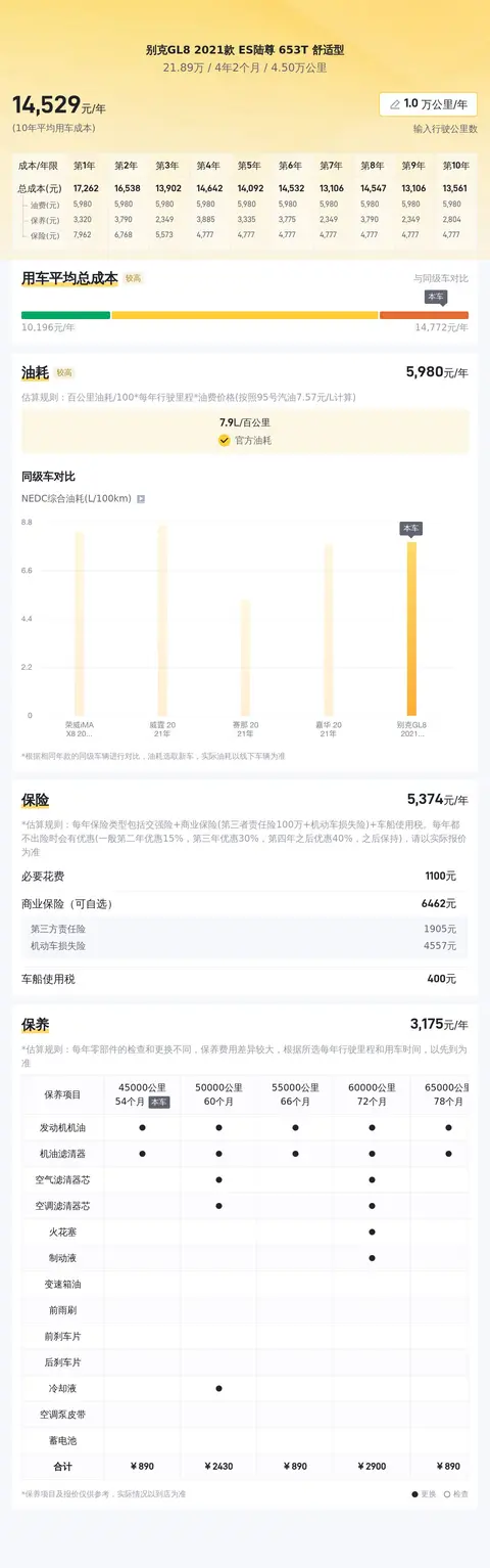 据估算,别克GL8 2021款 ES陆尊 653T 舒适型的用车成本也低,因为同级车的最低用车成本是13988元/年,最高是17798元/年,别克GL8 2021款 ES陆尊 653T 舒适型是15535元/年,所以较低。