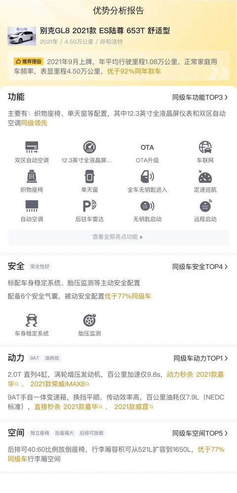 优势就是这辆别克GL8 2021款 ES陆尊 653T 舒适型属于高配车,该有的配置都有,第二排电动调节、自适应巡航、自动泊车入位、OTA升级等配置都是同级领先的配置,并且市场保值率很高。