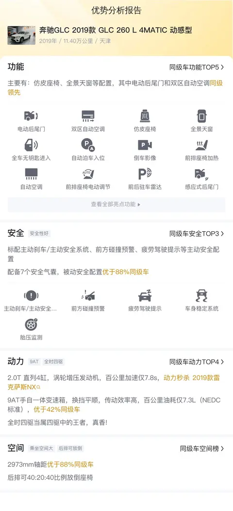 原价40几万的车,所以它的配置也不会差到哪里去。奔驰GLC 2019款 GLC 260 L 4MATIC 动感型配备了仿皮座椅、全景天窗、自动泊车入位、倒车影像、疲劳驾驶提示、电动后尾门、双区自动空调等配置。