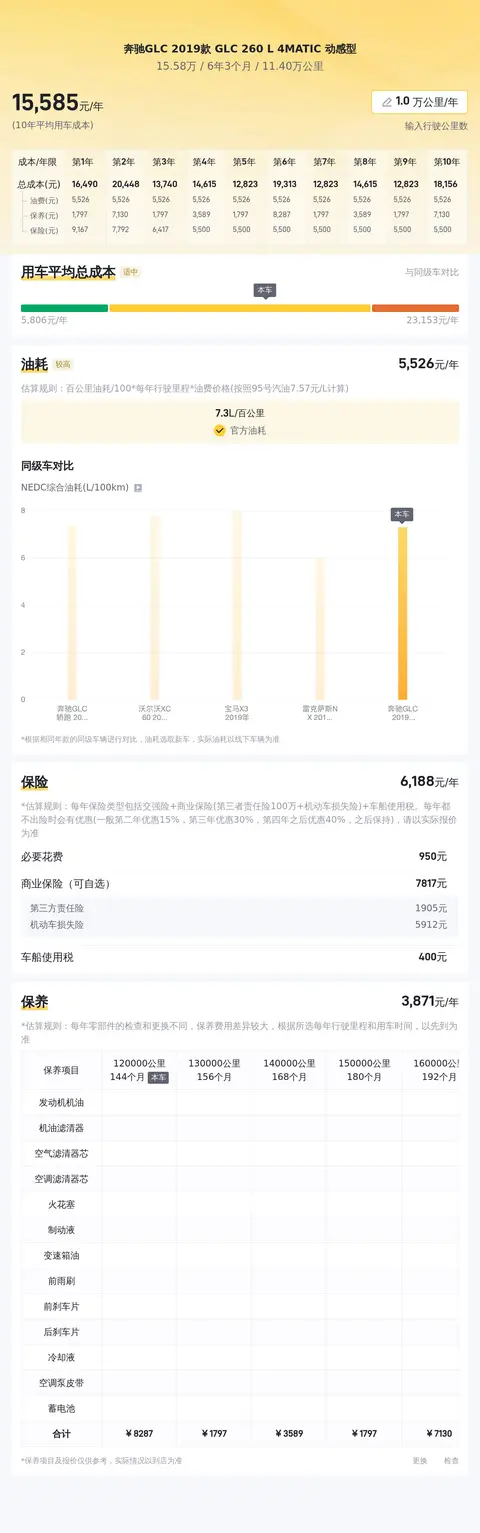 另外,据估算,同级车的最低用车成本是6506元/年,最高是18790元/年,奔驰GLC 2019款 GLC 260 L 4MATIC 动感型是15672元/年,基本处于适中的水准。