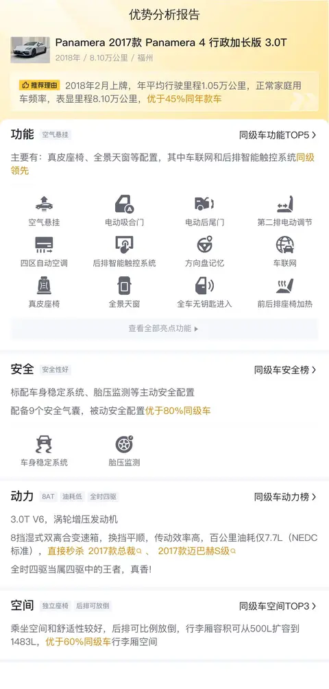 这辆保时捷Panamera是2017年款的Panamera 4 行政加长版 3.0T,上牌地为福州,上牌日期2018年2月,表显里程8.1万公里,新车指导价120.60万,如今二手车报价50.88万,过户次数1次。