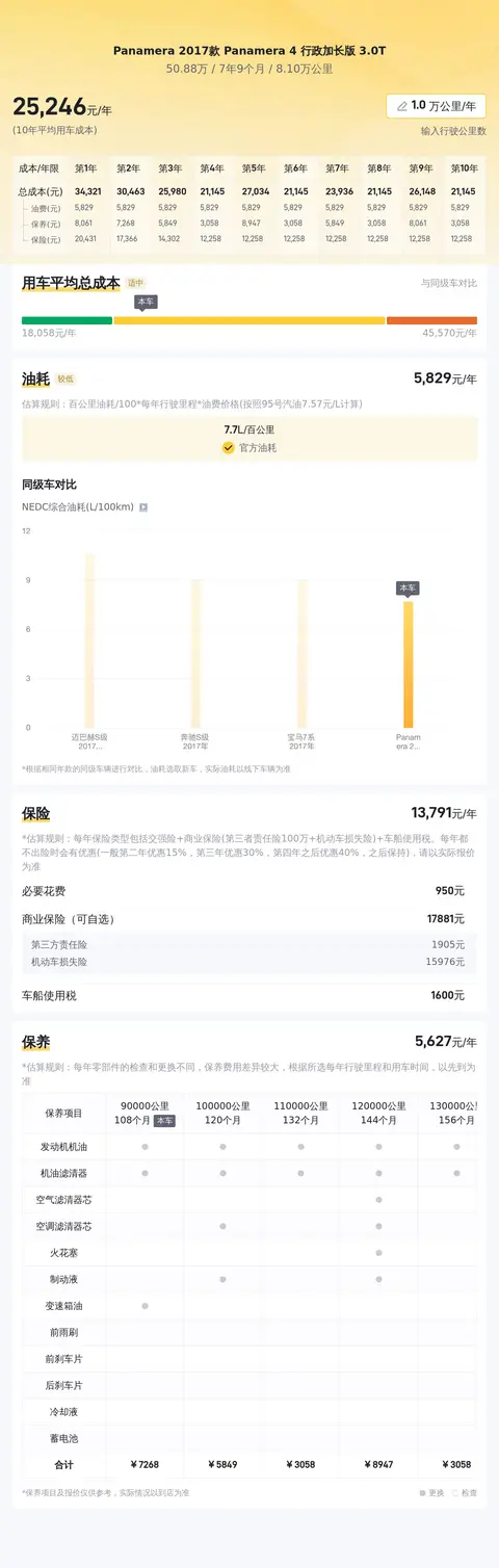 养车成本方面,这辆车的官方百公里油耗为7.7L,按每年行驶一万公里里程计算,燃油费用约为6471元,年度商业保险约17474元,每年保养费用约10410元,平均年度用车总成本约34355元,这些费用不包含停车费及洗车费等人均不同生活习惯产生的损耗费用。总体来看,这款豪车的养车费用还是可以接受的。