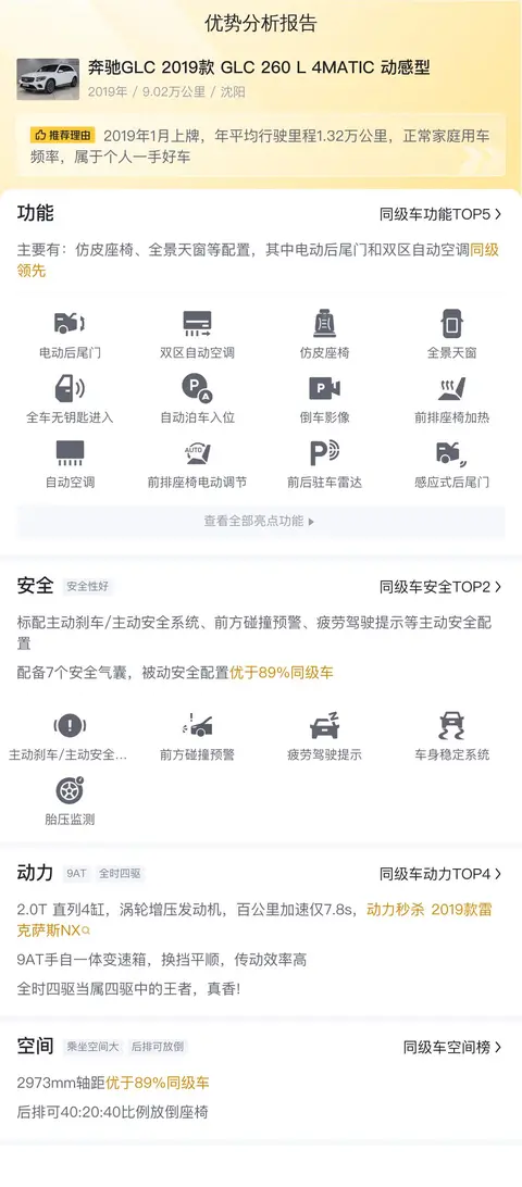 另外,同级车的最低10年平均用车成本是14985元/年,最高是21993元/年,奔驰GLC 2019款 GLC 260 L 4MATIC 动感型是16477元/年,是适中的水准。