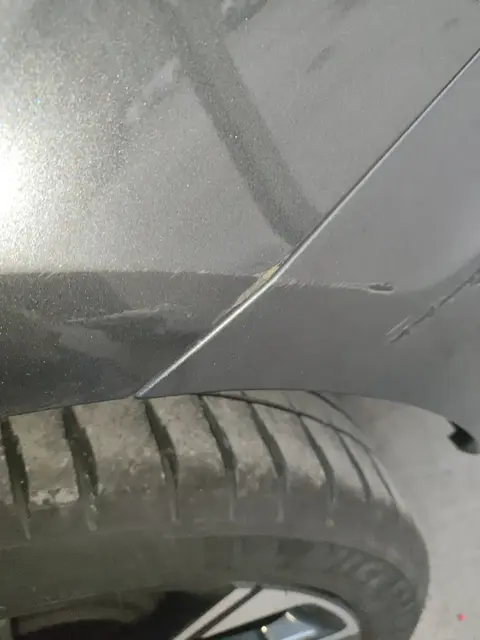 左后翼子板,剐蹭(S<10cm²),受尖锐物体划伤造成油漆面受损,未伤及底漆可通过局部抛光或喷漆恢复外观美观性,不会对车辆安全性能造成影响,不影响车辆正常使用。