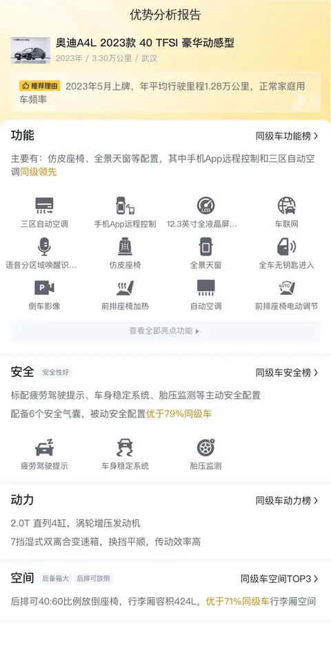 总的来说,奥迪A4L 2023款 40 TFSI豪华动感型是一款集豪华与性能于一身的车型。它不仅拥有出色的驾驶性能,还提供了宽敞的空间、舒适的乘坐体验和全面的安全配置。如果你正在寻找一款既能在城市中穿梭自如,又能在高速公路上飞驰的车型,那么这款车绝对是一个不错的选择。当然,具体的价格还需要根据车辆的实际情况来评估。如果您对这款车感兴趣,不妨亲自前来看看,相信它一定会给您带来不一样的驾驶体验!