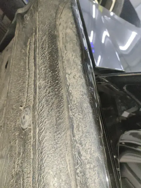 左侧底边梁,外侧变形(L<10cm),受外力作用产生的形状改变,不影响部件结构强度,不影响车辆使用。