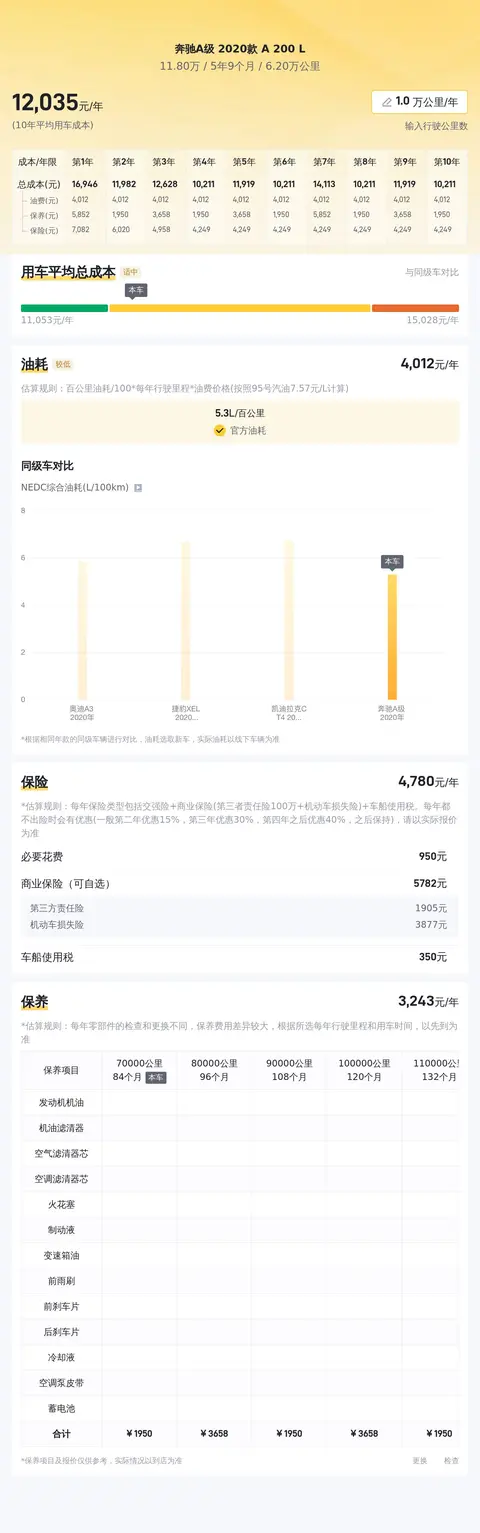 目前,这款车型的二手车市场价格大约在 11.8 万元左右。具体的价格会受到车辆状况、行驶里程以及维护记录等因素的影响。购车时,建议您仔细检查车辆的各项状况,并咨询专业人士的意见,以确保购买到性价比高的车辆。关于用车成本方面,我们将通过一些真实用户的实际油耗数据,为您提供更为准确的参考。根据 UCar 交车中心的大数据分析,奔驰 A 级 2020 款 A 200 L 的真实用户油耗约为 6.6 升/百公里。这一数据基于大量真实用户的日常使用情况得出,考虑到了不同驾驶习惯、路况以及车辆负载等因素对油耗的影响,因此更具实际参考价值。需要说明的是,真实用户的油耗数据仍然存在一定的波动范围,这主要是由于个体差异、使用环境以及车辆维护状况等因素所导致的。在正常