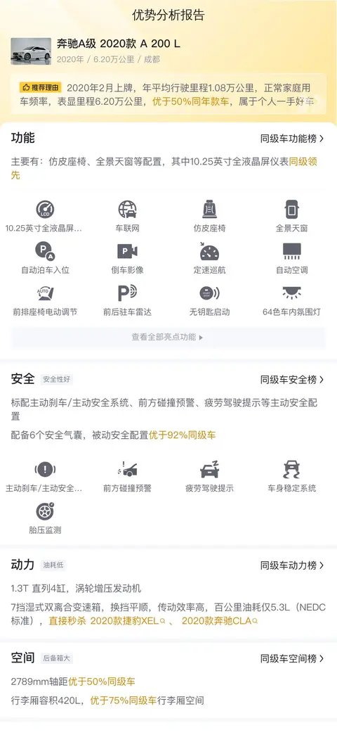 总结:如果您正在寻找一款性价比高、车况良好的二手豪华紧凑型轿车,那么这辆奔驰 A 级 2020 款 A 200 L 绝对值得您的关注。它的外观设计时尚大气,在阳光下显得格外耀眼;内部空间宽敞,无论是前排还是后排乘客都能享受到舒适的乘坐体验。在动力方面,它搭载的 1.3T 发动机能够满足日常使用需求,同时燃油经济性的表现也非常出色。更重要的是,这款车经过懂车帝300余项官方检测,获得了不错的车况评分,让您在购买时更加安心。总的来说,奔驰 A 级 2020 款 A 200 L 是一款集豪华、实用于一体的紧凑型轿车,无论是在日常通勤还是周末出游中都能为驾驶者带来愉悦的驾驶体验。如果您正在寻找这样一款车型,那么它绝对是一个不容错过的选择!