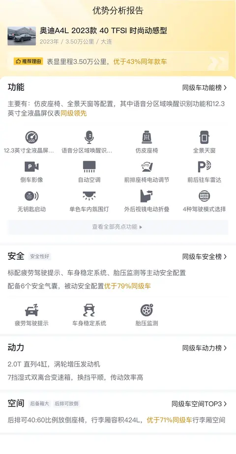 综上所述,奥迪A4L 2023款 40 TFSI 时尚动感型是一款集优雅设计、卓越性能和丰富配置于一身的豪华中级车。它不仅适合日常通勤,也适合家庭出行和商务接待等场合。如果您正在寻找一款性价比高、品质出色的豪华中级车,那么奥迪A4L 2023款 40 TFSI 时尚动感型绝对是一个不错的选择。