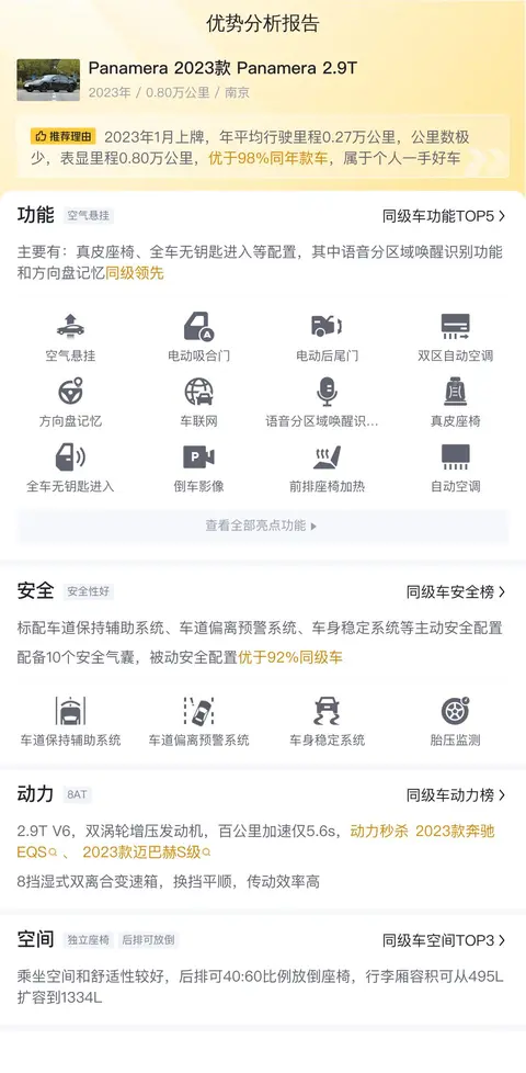 在二手车市场上,Panamera 2023款 Panamera 2.9T的行情价是80.17万-96.96万,它的报价则是81.8万,报价偏低,同时保值率也高,开了仅1年多便宜了27.09万,很占优势。