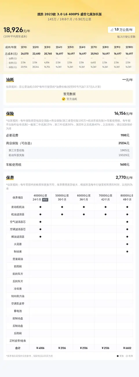 据估算,揽胜 2023款 3.0 L6 400PS 盛世七座加长版的用车成本是23781元/年,同级车的最低是18777元/年,最高是70668元/年,所以它的用车成本偏低。