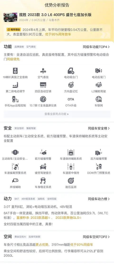 综上所述的新车含税价、用车成本、市场行情、优势分析、同款比价等数据仅供参考。在配置部分,因为二手车非标品,车辆可能会存在配置改装的情况,具体车况信息需要线下结合车辆实际情况进行综合参考。