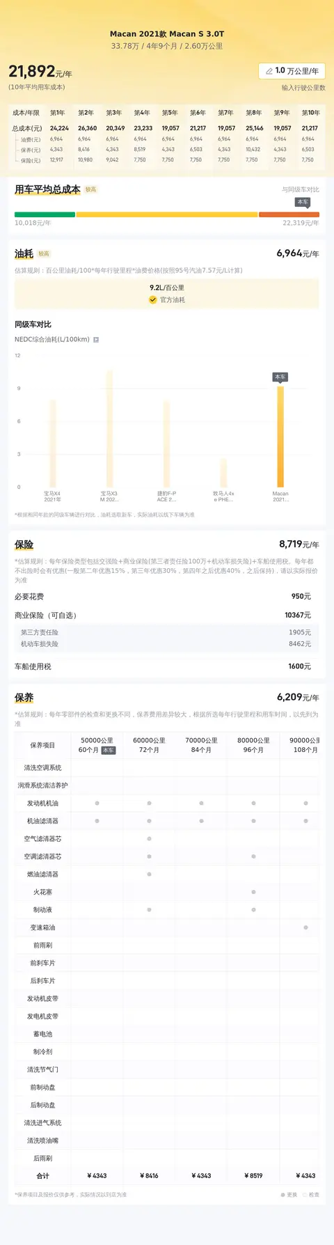 当前市场上,这款车型的二手车价格大约在36.15万至43.62万元之间。当然,具体的售价会受到车辆状况等因素的影响。关于用车成本方面,根据估算,这辆Macan的年均综合用车成本大约在2.2万元左右。需要注意的是,实际费用支出可能会因个人用车习惯等因素而有所差异。