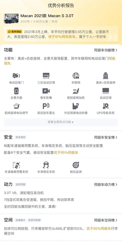 在竞争激烈的市场中,车辆的配置和性能显得尤为重要。这辆Macan S 3.0T在配置方面表现出色,不仅配备了电动后备厢、全景天窗等实用配置,还搭载了多项智能驾驶辅助系统,为驾乘者提供了更加便捷和安全的用车体验。同时,其强大的动力系统和精准的操控性能,也让它在同级别车型中脱颖而出。