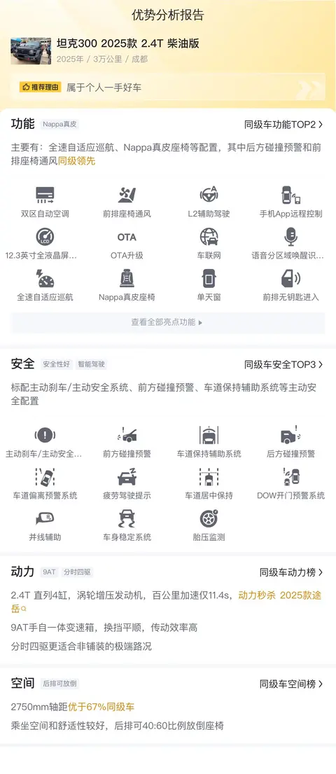 坦克300 2025款 2.4T 柴油版配备了全速自适应巡航、后方碰撞预警、前排座椅通风、方向盘加热、语音分区域唤醒识别、Nappa真皮座椅等配置,其中后方碰撞预警和前排座椅通风同级领先。