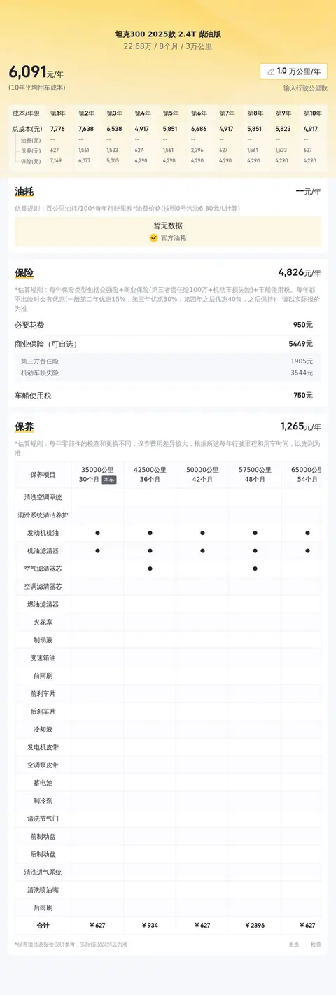 据估算,坦克300 2025款 2.4T 柴油版的用车成本是6991元/年,原价20多万的车,用车成本算是比较低了。