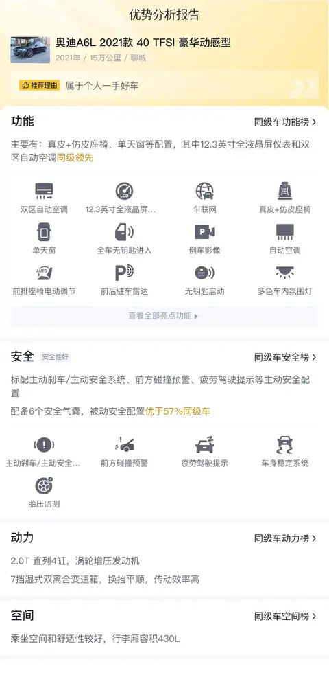 综上所述的新车含税价、用车成本、市场行情、优势分析、同款比价等数据仅供参考。在配置部分,因为二手车非标品,车辆可能会存在配置改装的情况,具体车况信息需要线下结合车辆实际情况进行综合参考。