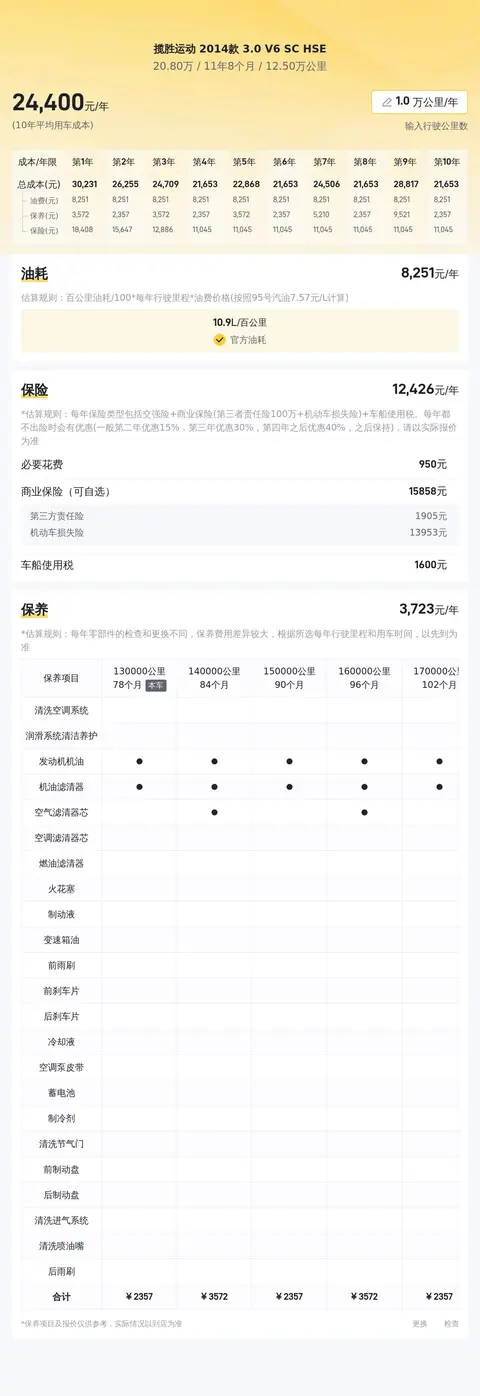 关于用车成本方面,根据我们的估算,这辆车的年均综合用车成本大约在2.4万元左右。需要指出的是,实际费用支出可能会因使用频率、环境条件等多种因素而有所变动。