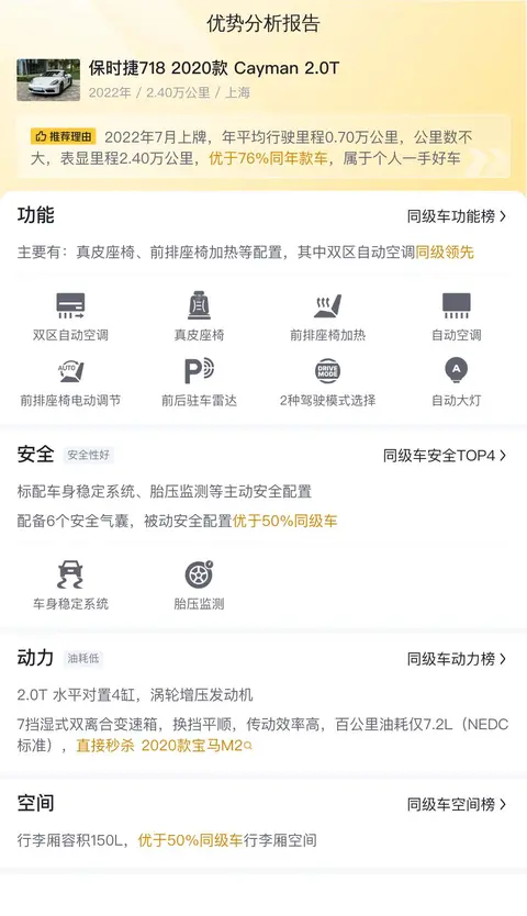 当谈论跑车时,“保时捷911”经常是人们首先想到的车型,它已成为了保时捷品牌的象征。然而,如果911对你来说暂时还无法承担,但你又渴望拥有一辆属于自己的保时捷,那么今天要说的这款保时捷718(图片|配置|询价) 就非常合适了。保时捷718的设计理念旨在提供卓越的驾驶体验,强调操控性和驾驶乐趣。相比911,718通常会搭载排量较小的发动机,从而带来更为亲民的价格。今天我们就为您带来一辆二手保时捷718。先介绍一下车辆的基本信息,该车的具体版本是:保时捷718 2020款 Cayman 2.0T,上牌地为上海,上牌日期2022年7月,表显里程2.4万公里,新车指导价54.5万,二手车报价44.8万,车身颜色白色,过户次数0次。