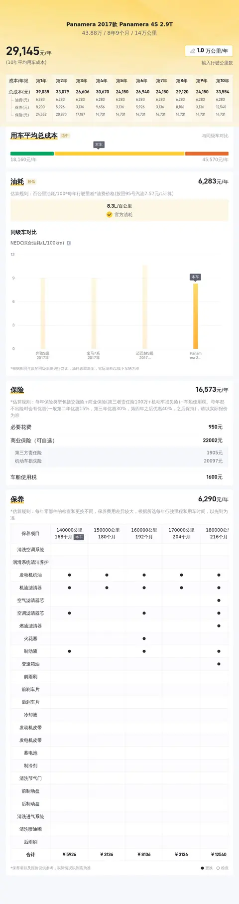 这辆二手保时捷Panamera 2017款 Panamera 4S 2.9T的10年平均用车成本是28687元/年,同级车最低是21873元/年,最高是40318元/年,所以它的10年平均用车成本偏高。
