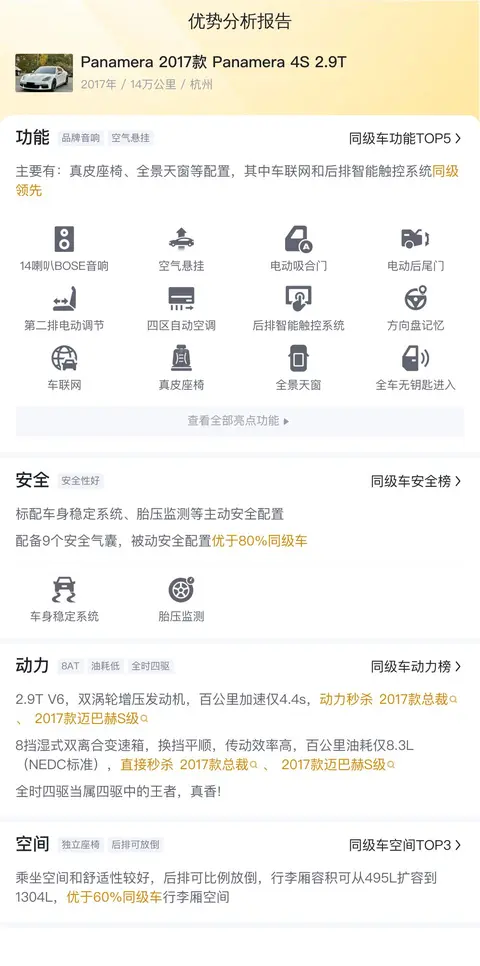 以上就是今天分享的关于这辆二手保时捷Panamera 2017款 Panamera 4S 2.9T的全部信息,包括车辆的基本情况、具体配置、市场行情与用车成本等。这辆车在配置、动力、空间等方面表现都不错,如果你在找这个类型的车型,刚好预算在40多万,那可以考虑一下哦。