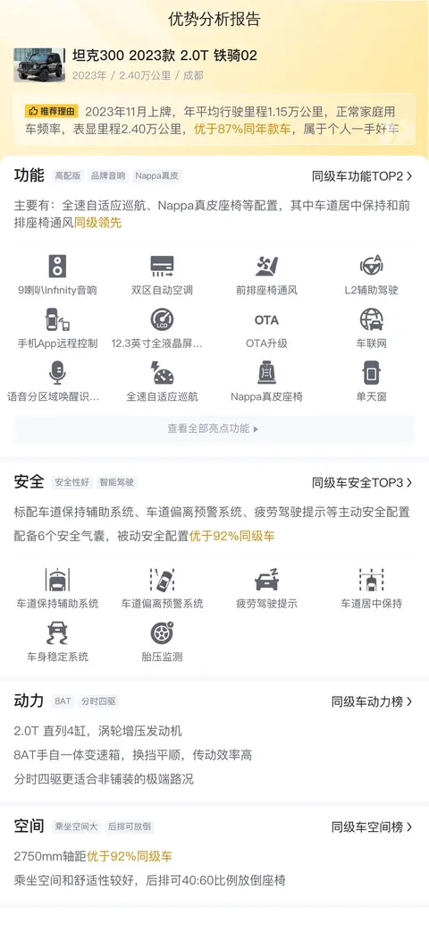 综上所述,便是今天跟大家分享的关于二手坦克300 2023款 2.0T 铁骑02的部分信息,如果你对这款车感兴趣,那么不妨花些时间研究一下,毕竟买车是一件大事,容不得马虎,希望最终你能买到自己心仪的车型。