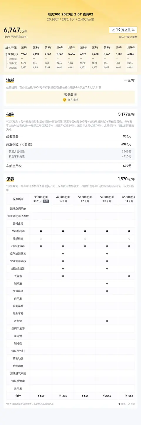说完市场行情,咱们再聊下用车成本,这里不得不说的是虽然该车是越野车,但日常家用也是OK的,而既然是家用车,那必然要考虑到用车成本,经过计算,该车10年平均用车成本约13685元/年,其中油费约10412元/年,保险费用约3040元/年,保养费用约1232元/年。看到这可能有车友会说,这油耗也太高了吧?!别着急,且往下看咱俩慢慢唠。该车WLTC综合油耗为11.9L/百公里,看到这我寻思着谁开车这么狠啊?一查才知道是 WLTC 测试标准太狠了,WLTC 测试标准下的油耗往往更加接近真实油耗,咱就是说这油耗也太离谱了,不过转念一想,这可是越野车,有这油耗也属正常。