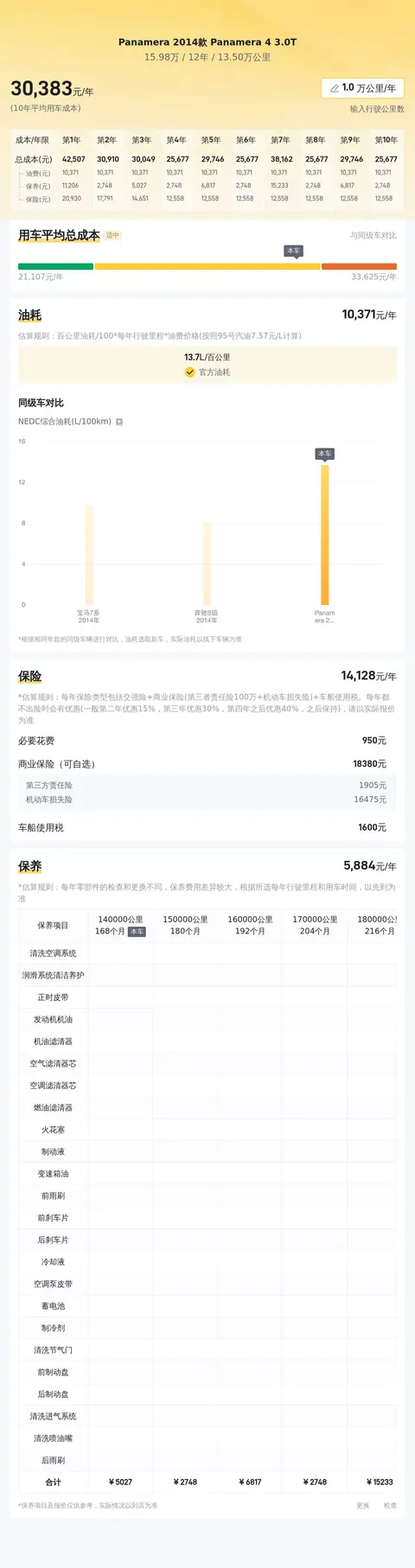 据估算,同级车的最低用车成本是21709元/年,最高是44786元/年,Panamera 2014款 Panamera 4 3.0T是30279元/年,用车成本不算低。