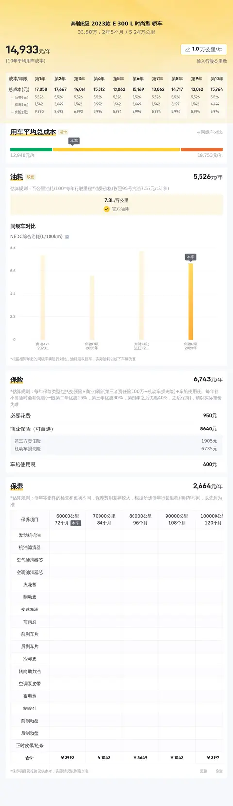 据估算,同级车的最低用车成本是13980元/年,最高是18720元/年,奔驰E级 2023款 E 300 L 时尚型 轿车是15708元/年,用车成本适中,但不占优势。