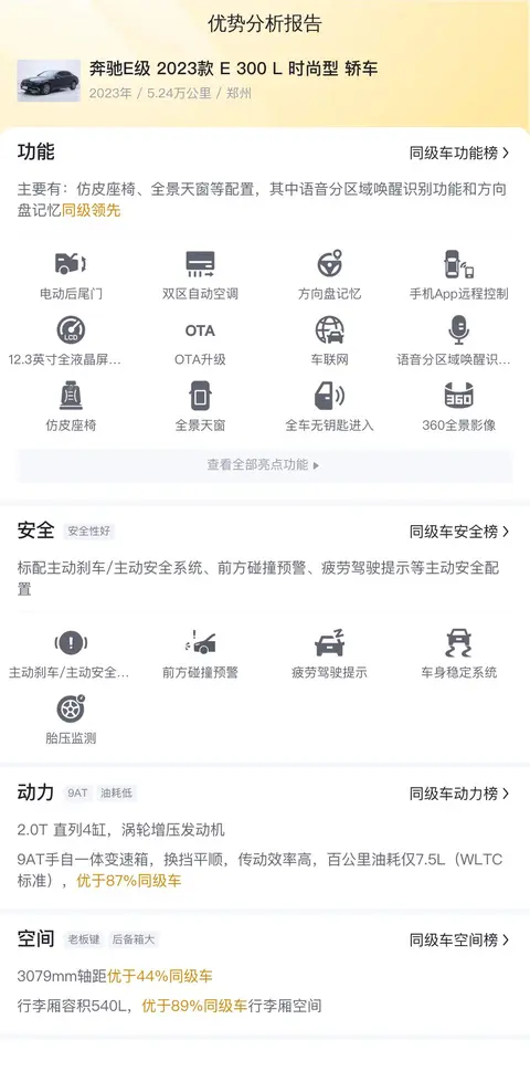 优势:毕竟是2023款的车,所以配置也比较丰富。奔驰E级属于热门车型,本身市场欢迎度比较高,保值率也高。加上车子本身用得不多,基本是准新车,更受市场欢迎。价格却低于市场行情,比较划算。动力强劲,配置齐全,空间也比较宽敞。