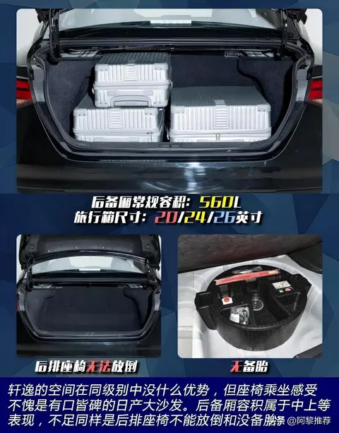 后备厢官方常规容积为510L,内部造型规整,无明显凸起结构,空间利用率较高,可轻松容纳20、24、26英寸三个不同规格的行李箱,且仍有剩余空间,足以应对日常购物、短途旅行等场景的储物需求。后排座椅支持4/6比例放倒,放倒后可进一步拓展储物空间,完全能够容纳折叠婴儿车、小型露营装备等大件物品。此外,全系标配非全尺寸备胎,可满足应急使用需求,提升了出行的便利性与安全性。